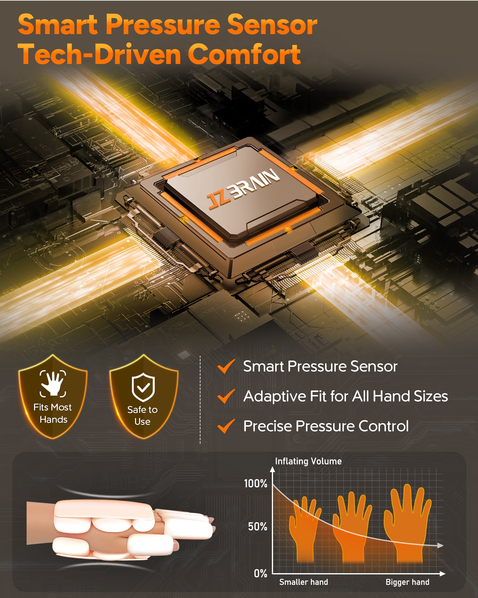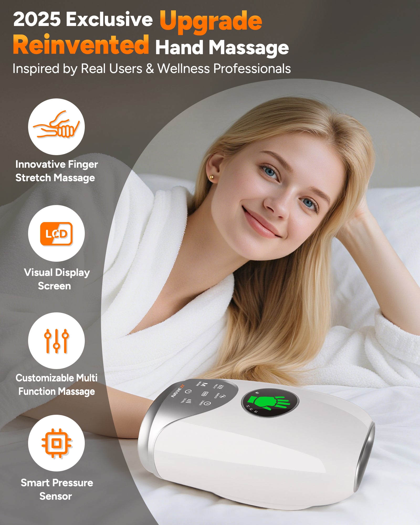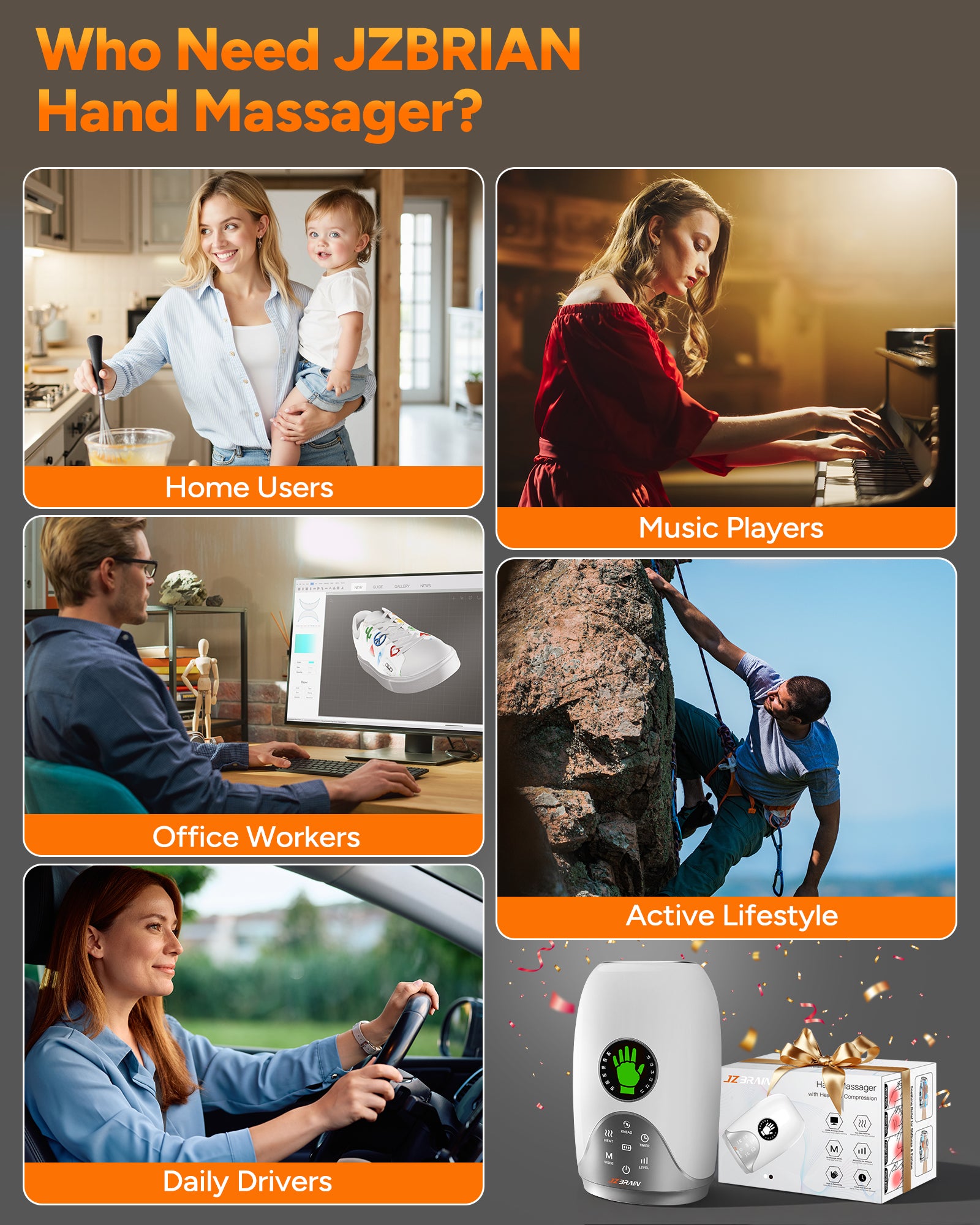 - 【Genuine Full-Hand Comfort, Inspired by Real Users】 JZBRAIN 2025 upgraded hand massager is thoughtfully designed with insights from everyday users and wellness professionals. Its exclusive Finger Stretch Massage gently extends each finger using rhythmic air pressure, helping to loosen stiffness and improve flexibility. Full-hand comfort with 360° wrap-around compression from fingertips to wrist, it provides full-hand relief for tension caused by daily stress, repetitive motion, or overuse.